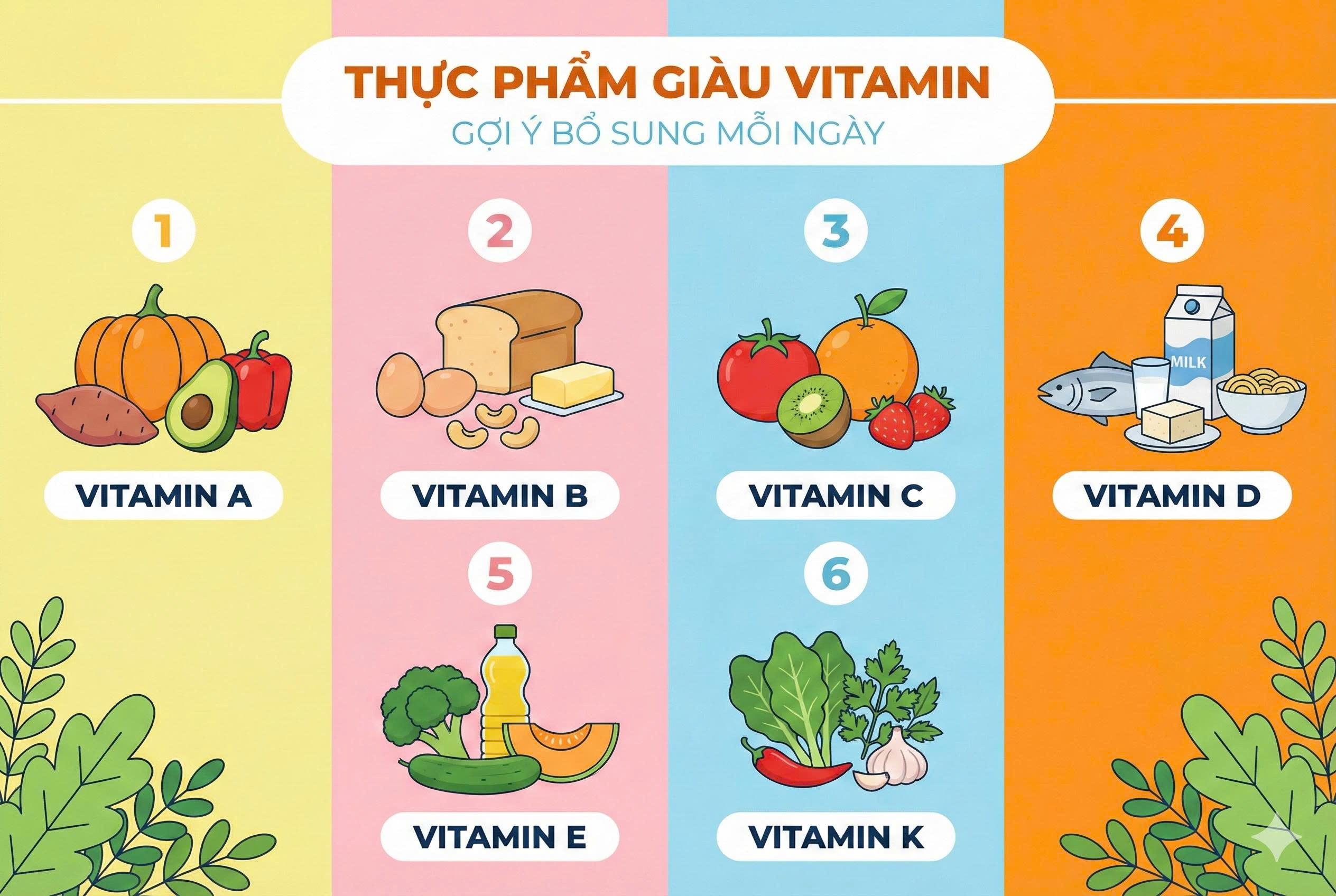 Ưu tiên dinh dưỡng tự nhiên: Cho trẻ ăn đủ nhóm chất, đa dạng thực phẩm. Rau xanh, trái cây, cá, trứng, sữa là nguồn vitamin tự nhiên, dễ hấp thu và an toàn nhất.